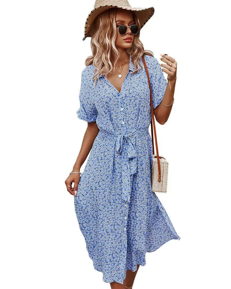 Upgrade your wardrobe with this Women's Casual Floral Chic Midi Dress. Made from a blend of COTTON and POLYESTER, it offers a comfortable and stylish fit. The V-neck and A-line silhouette add a touch of bohemian charm, while the chiffon fabric and floral print elevate the look. Perfect for summer, complete with a sash for a flattering fit.