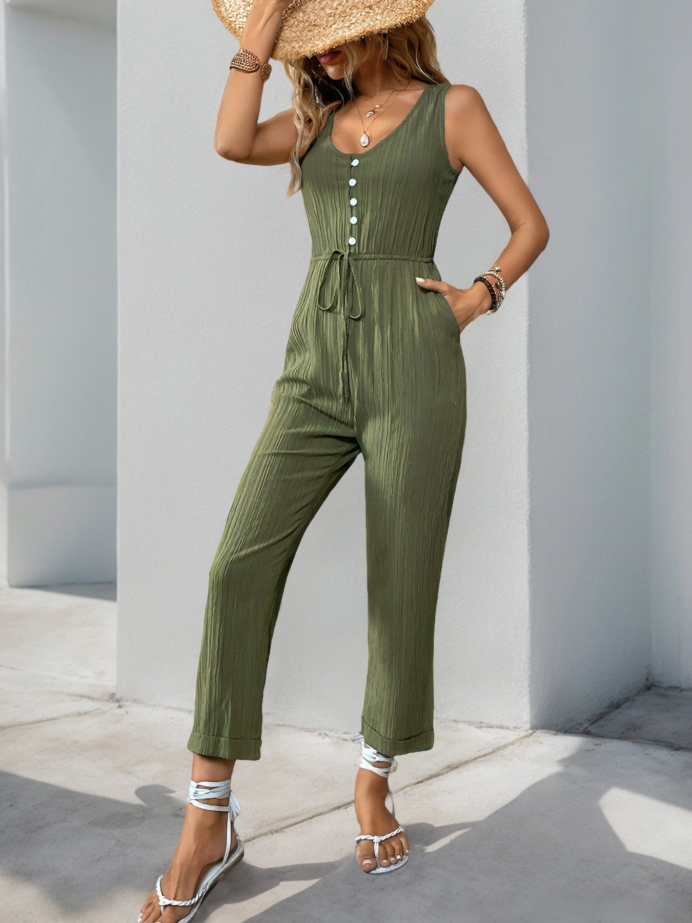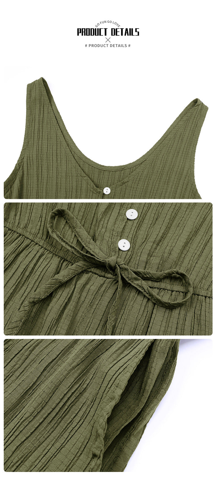 Step into effortless summer style with our Women's Casual Jumpsuit, perfectly designed for the middle-aged woman. Crafted from comfortable polyester broadcloth, this sleeveless, straight-leg jumpsuit offers a regular fit and a flattering high waist. Its inelastic, standard thickness ensures a smooth silhouette, while the chic lace-up decoration adds a touch of casual elegance. Available in versatile solid colors including Army Green, Khaki, Dark Gray, Black, and Dark Blue, this jumpsuit is your go-to for daily wear during the warmer months.